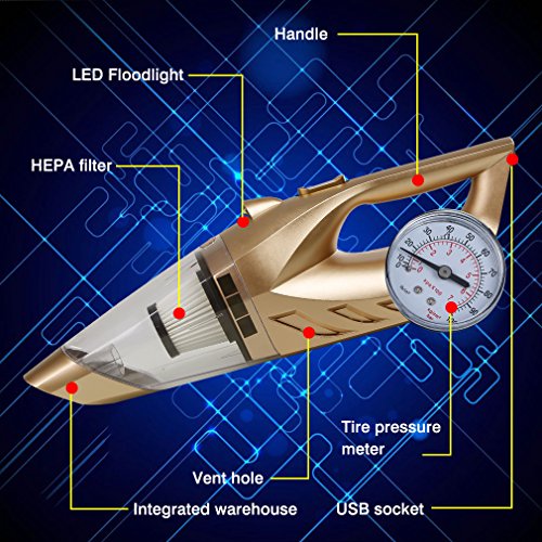 -. Feature : [MULTIFUNCTIONAL USE]: 5 functions: Air inflation, dust collection, lighting, tire pressure measurement, USB power. Collecting 5 big functions in one car vacuum cleaner supports wet and dry use, can absorb dust and water stains effectively, making cleaning easier, helping you breathe fresh air even in the car. / [ENVIRONMENTAL DETACHABLE FILTER]: HEPA environmental detachable filter, filter all the dirt, avoid secondary air pollution. Reusable and easy-cleaned feature makes it become a big design highlight of the car vacuum cleaner; the effect of dust removal is greatly enhanced compared to tradition. / [STRONG SUCTION]: Slim nozzle equipped with strong suction can enter the gap without concern to deep clean some invisible bacteria, such as dust, mites, hair. The car vacuum cleaner provides strong suction to deep sterilization, beneficial for you to breathe unpolluted nature breath. / [LONG & CONVENIENT POWER CORD]: 4.5 meters power cord, standard length design, car vacuum cleaner can easily reach any corner of your car without any concern, even reaching to your back seat of your car, making your car full of unpolluted fresh air, spreading to every corner of the car. / [PRODUCT CONFIGURATION]: The car vacuum cleaner is combined with main machine, stretch hose, suck rod with brush; duck mouth suck rod, pipe line, attachment, and Instruction manual. Strong configuration is suitable different requirements for any corner of the car.