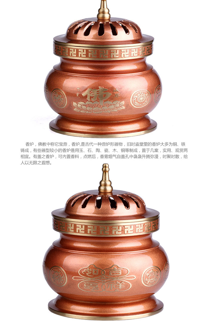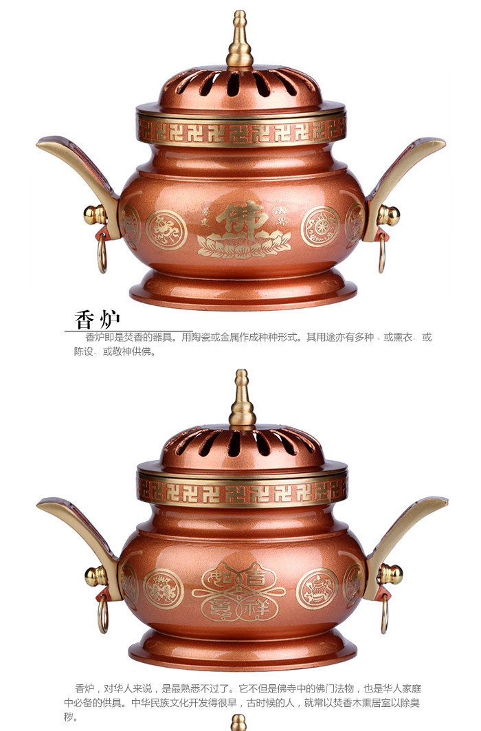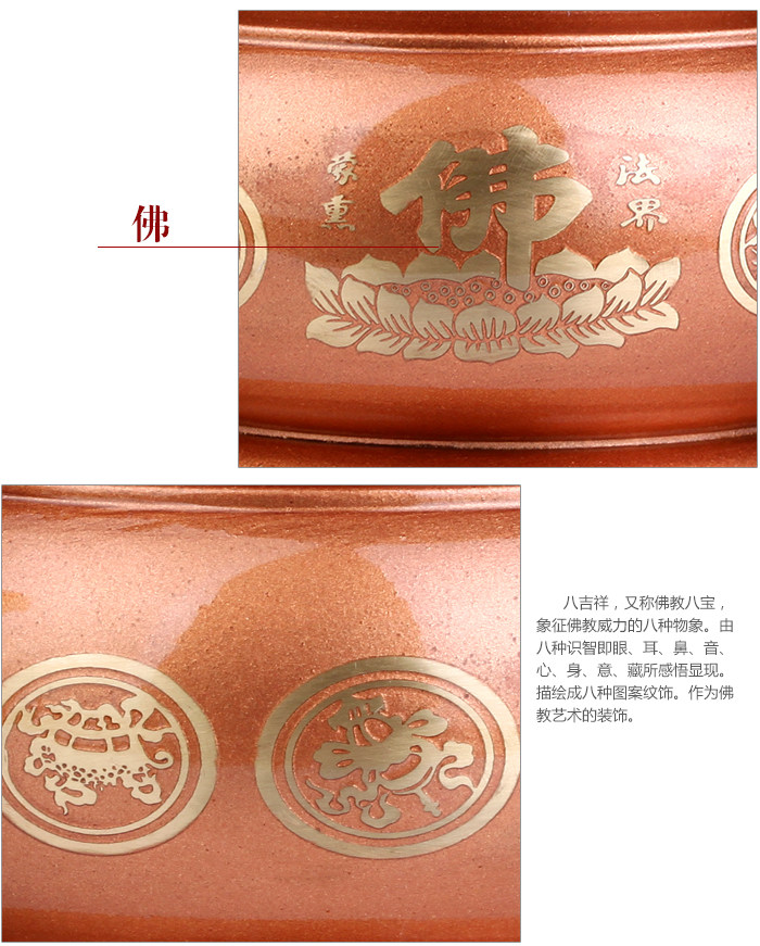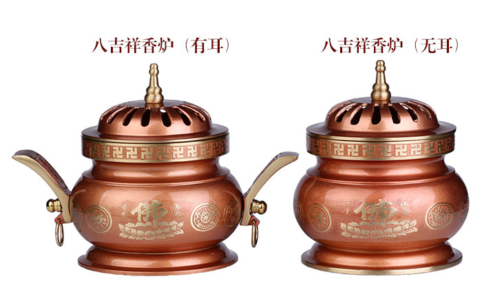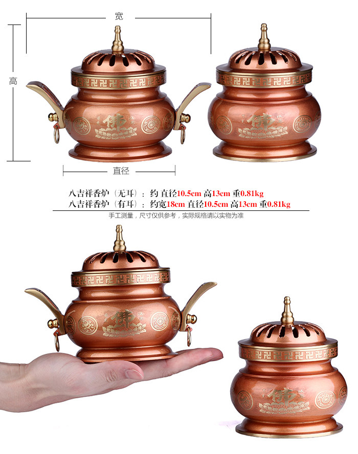Product features: The eight auspicious, also known as the Buddhist treasures, eight kinds of image symbol of Buddhism. By eight kinds of general intelligence is the eye, ear, nose, voice, heart, body, Italy, hide the perception ofapparent. As eight kinds of patterns. As the Buddhist decorative art. Product introduction: Name: incense burner Material: Copper Size: incense (Wu Er) about 10.5cm in diameter and high 13cm Incense burner (ears) about 18cm wide 10.5cm high 13cm diameter Weight: about 0.75kg burner (Wu Er) Incense burner (ears) about 0.81kg Packaging: general packaging |