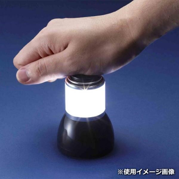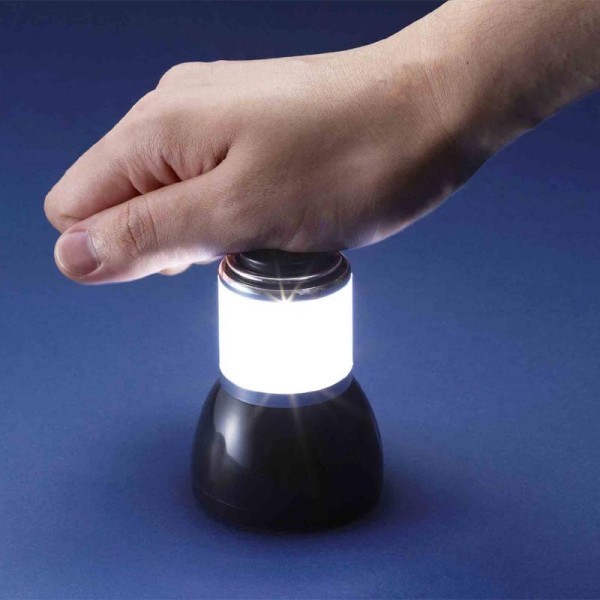 | 手のひらサイズで持ち運びもラクラク!!広範囲を照らすミニランタン。ランタン本体を上から押すだけで、点灯・消灯します。 |