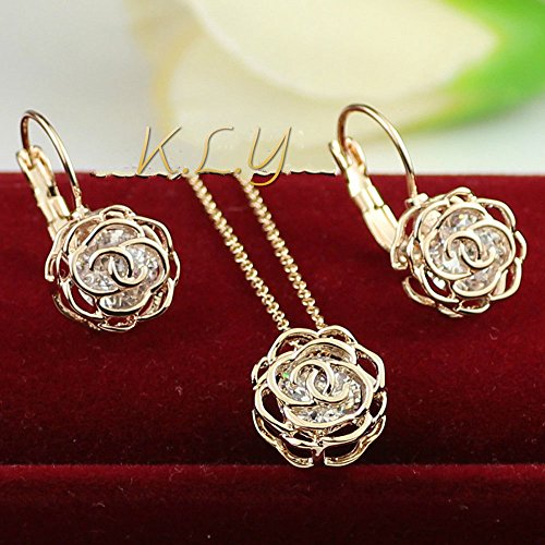 -. Title : K.L.Y ダイヤモンドCZ 薔薇 ローズ 花フープピアス18金RGPネックレス レディース ホワイトデー プレゼントオリジナルネックレスピアス3点セット (ピンクゴールド)ギフト包装