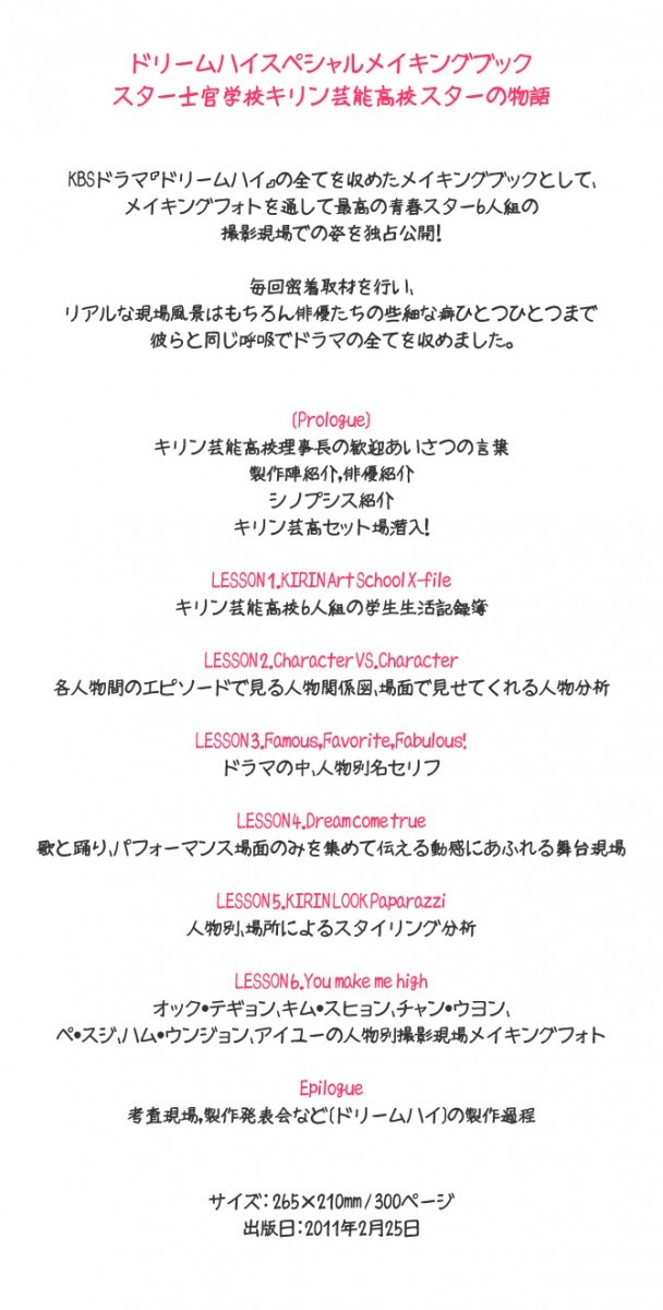 ★☆スター士官学校キリン芸能高校 スターの物語/KBSドラマ 『ドリームハイ』の全てを収めたメイキングブックとして、メイキングフォトを通して最高の青春スター6人組の撮影現場での姿を独占公開!毎回密着取材を行い、リアルな現場風景はもちろん俳優たちの些細な癖ひとつひとつまで 彼らと同じ呼吸でドラマの全てを収めました。★Prologue:キリン芸能高校理事長の歓迎あいさつの言葉製作陣紹介、俳優紹介、シノプシス紹介、キリン芸高セット場潜入!★LESSON 1:キリン芸能高校 6人組の学生生活記録簿★LESSON 2:各人物間のエピソードで見る人物関係図、場面で見せてくれる人物分析★LESSON 3:ドラマの中、人物別名セリフ★LESSON 4:歌と踊り、パフォーマンス場面のみを集めて伝える動感にあふれる舞台現場★LESSON 5:人物別、場所によるスタイリング分析★LESSON 6:オクテギョン、キムスヒョン、チャンウヨン、ペスジ、ウンジョン、IUの人物別撮影現場メイキングフォト★Epilogue:考査現場,製作発表会など 「ドリームハイ」の製作過程 【サイズ】21×26.5cm/全300ページ【メーカー】Jaye Entertainment