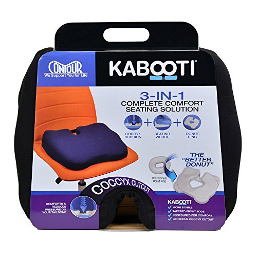 Studio : Contour Products, Inc. Publisher : Contour Products, Inc. Binding : Health and Beauty Product Description The Contour Products Kabooti Seat Cushion is a 3-in-1 complete seating solution! It combines the most beneficial features of a donut ring cushion, a coccyx tailbone relief cushion and a seating wedge into the ultimate ergonomic comfort seat. As a donut cushion, the Kabooti features a large center cutout which provides maximum comfort and relief for those looking for a hemorrhoid relief, post-partum comfort, piles or other sensitive conditions in your bottom area. With its Male/Female ergonomic recess, it makes sitting more comfortable as it reduces pressure and helps comfort you for extended periods of time. The tapered front wedge design reduces the pressure for your back when sitting, giving you relief in your lower back for those suffering from back pain, or forced to sit long hours. The tapered front on the Kabooti also encourages proper seating posture and allows you to easily slide under your steering wheel, desk or table. The back coccyx cutout allows your tailbone to rest comfortable without pressure. The coccyx cutout also connects to the center donut cutout to providing cooling airflow while you sit. Constructed from high quality support foam, the Kabooti cushion retains its shape even with every day use. In ordinary seats or when using ordinary donut cushions, we encounter painful pressure points, however the Kabooti's ergonomic sculpted surface contours to your body and allows your body weight to be evenly distributed which reduces pressure points, especially when sitting for long periods of time in your chair, on a plane, in your car or at your desk. Making ordinary donut cushions obsolete, the Contour Products Kabooti donut pillow cushions provides you with the support and comfort you need to sit pain free. Includes black 2-way stretch cover that features a handle sewn in for easy carrying, and transportation. 0