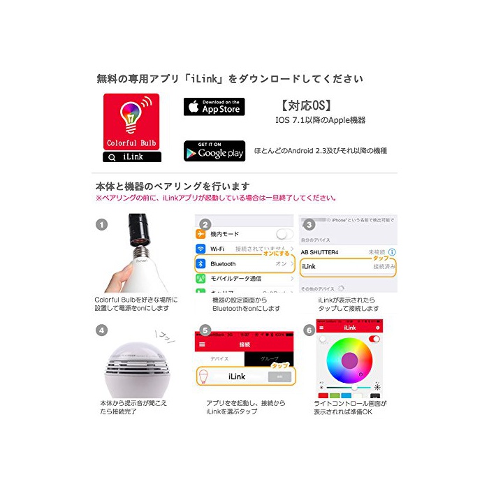 【사용에 간단】이용 중의 전구와 교환 하는 것만으로,전원이나 기구는 필요 없습니다.E26/E27통용 물림쇠이기 때문에,현재 이용 중의 일반 전구와 교환 하는 것만으로,전원이나 조광기구 등을 준비하는 필요는 없습니다.소지의《스마호》,타블렛에서 모든 기능을 콘트롤에 옵니다.적용 된 기종:Android 2.3및2.3이상,Iphone4S/5/5S/6/6S,IOS 7.1및7.1이상의 버젼으로 향합니다.
