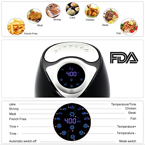 7 Cooking Programs: Chips, Chicken, Steak, Shrimp, Meat, Cake, Fish. 2.7 Quarts (2.6 L) cooking basket capacity, touch screen menu, adjustable Temperature control for frying, baking, grilling or roasting