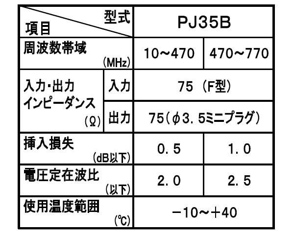 | 仕様 | 屋内用 UHF・VHF・FM RoHS対応 使用温度範囲:-10~+40度 インピーダンス/入力:75Ω(F型)・出力:75Ω(φ3.5mmミニプラグ) ●周波数帯域10~470MHz 挿入損失:0.5dB以下 電圧定在波比:2.0以下 ●周波数帯域470~770MHz 挿入損失:1.0dB以下 電圧定在波比:2.5以下 |