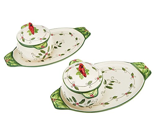 Studio : Temp-tations Publisher : Temp-tations Product Description Cardinal rule. Serving soups and sandwiches on charming serveware becomes standard with this delightful set on hand. A handpainted holly leaf and berry design is topped off with a sculpted cardinal on the soup bowl lids. Lids will help to keep the soup warm. From Temp-tations(R) Ovenware. 0