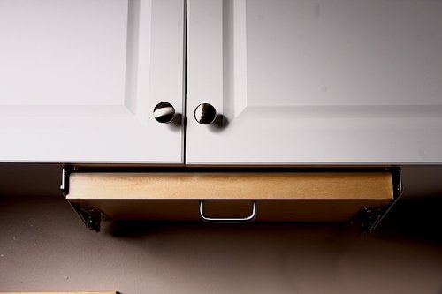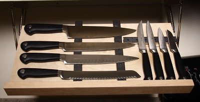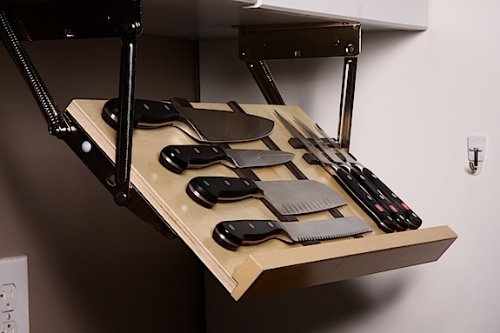 Product Description The Drop Block removes clutter from your counters and allows you to see your entire selection of knives. With a traditional knife block, you are constantly lifting one knife after another to see if it is the one you want. With The Drop Block this is eliminated because all knives are right in front of you when lowered. When The Drop Block is raised, they are out of sight and safely tucked away.