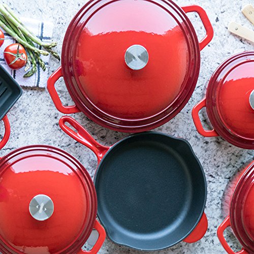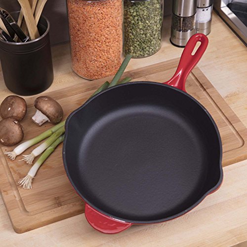 SUPERIOR DESIGN: Our coated cast iron skillet features an ergonomic handle, pour spouts, and superior heat distribution and retention to evenly tenderize meats, poultry, and vegetables.