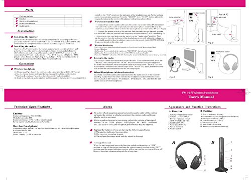 -. Feature : This item will never dissatisfy you: 5-in-1 Multifunctions (Wireless Earphone + Wireless Net Chat Tool + FM Radio + Wired Earphone + Wireless Monitor), high sensitivity, interference resistance, strong signal, outstanding performance, effective range and reception beyond obstacle of wall. / Wireless Earphone: Wireless reception from any electrical device with audio output such as full-channel TV sound, PC, game player, DVD player, VCD player, audio device, MP3 player, and CD player. / Wired Earphone: Equipped with audio cable, the receiver can be used as a wired earphone / Wireless Net Chat Tool: It's a perfect audio-chat tool, provides infinite enjoyment. / FM Radio: The headset can be used as FM radio separately, which search and lock channels automatically. / Wireless Monitor: Place the emitter near babies, old people and sick people who need care, and the sound of the cared people can be heard from the receiver.