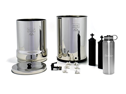 - BOROUX BUNDLE INCLUDES 4 ITEMS: 1 Boroux 40 oz Double wall stainless steel WIDE MOUTH BOTTLE 1 Crown Berkey System 6 GALLON CAPACITY (stainless steel water filter) with 2 Black Berkey Purification Elements (Powerful Water Filters). All parts and pieces are BPA free. CROWN BERKEY IS THE LARGEST BERKEY WATER FILTER SYSTEM IDEAL FOR LARGE GROUPS 10+ people