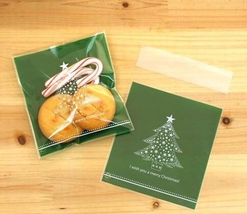 Yunko 100pcs Christmas Tree Cookie OPP Packaging Self-adhesive Plastic Bags for Biscuits Package