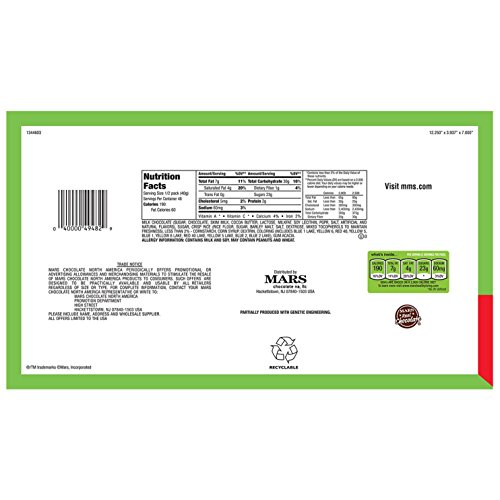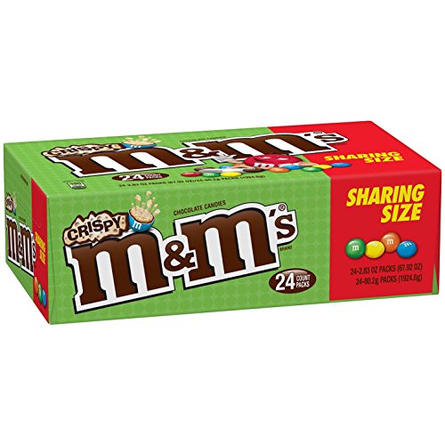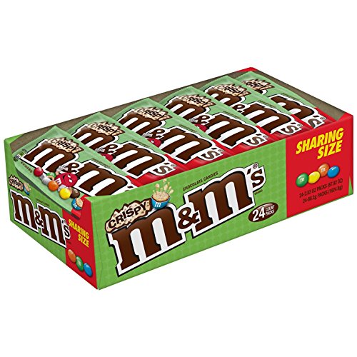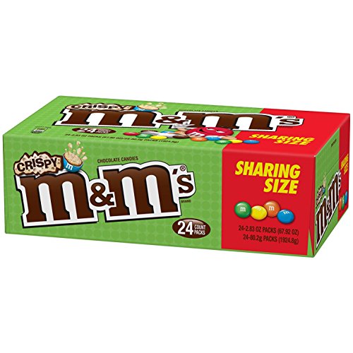 -. Binding : Grocery -. Brand : M & M's -. EAN : 0040000494829 -. Feature : Contains one (1) box of twenty-four (24) 2.83-ounce pouches of M&M'S Sharing Size Crispy Chocolate Candy / M&M'S Crispy Chocolate Candy features a crispy center, coated with milk chocolate and in a colorful candy shell / Grab a friend or make a new one; this sharing size bag has two servings of M&M'S Candy / A new spin on an old classic, Crispy M&M'S Candy adds a fun crunch to your favorite chocolate treat at 180 calories per serving / Gone for more than a decade and brought back by popular demand, this crispy chocolate snack is back -. IsAdultProduct : 0 -. Label : M&M's -. Manufacturer : M&M's -. MPN : BCG291401 -. NumberOfItems : 24 -. PackageQuantity : 1 -. PartNumber : BCG291401 -. ProductGroup : Grocery -. ProductTypeName : GROCERY -. PublicationDate : 2014-10-17 -. Publisher : M&M's -. ReleaseDate : 2014-12-05 -. Size : 2.83-oz. Pouch(24-Count Box) -. Studio : M&M's -. Title : M&M'S Crispy Chocolate Candy Sharing Size 2.83-oz. Pouch, 24-Count Box -. UPC : 040000494829