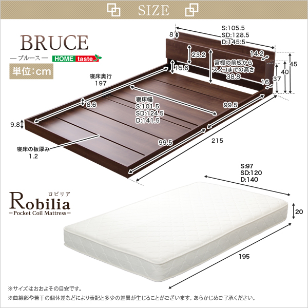 外寸:(ベッド)(約)幅105.5cmx奥215cmx高45cm