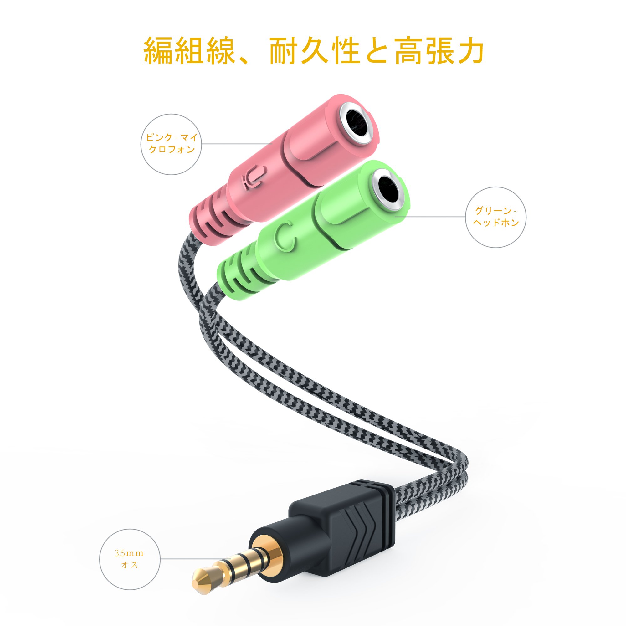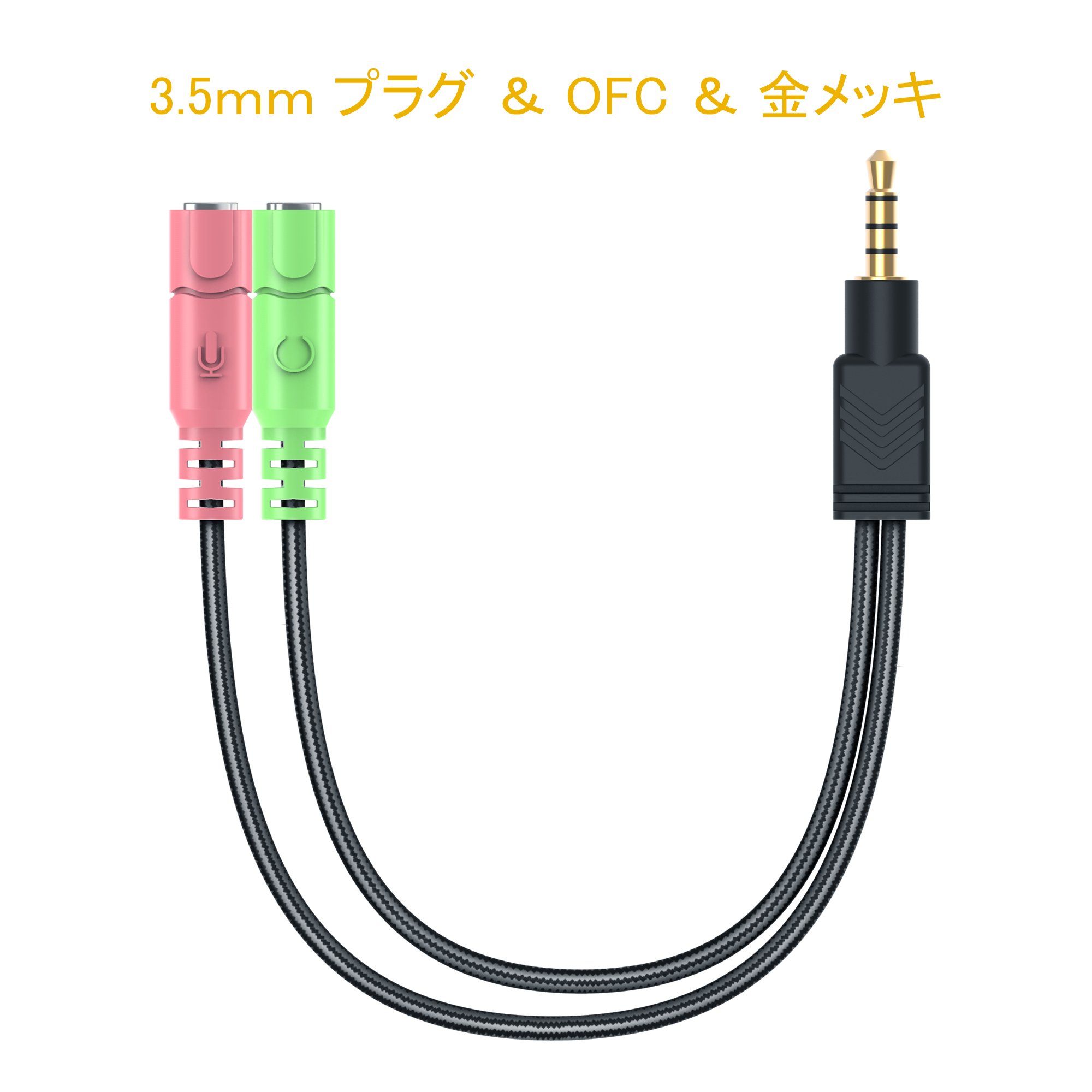 2 female 3.5 mm 3 pole mini jack (earphone is green, microphone is pink), 1 male 4 pole 3.5 mm plug