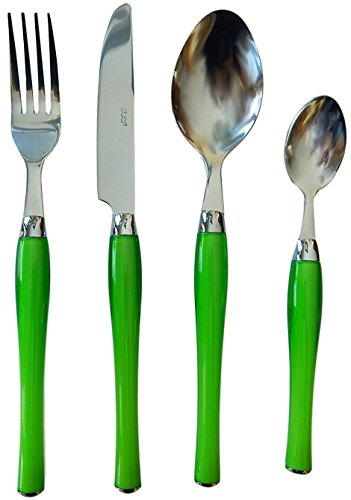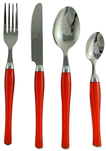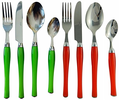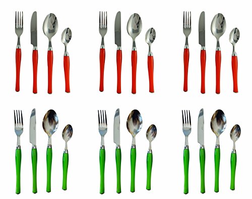 - Set contains 6 dinner spoons, 6 tea or coffee spoons, 6 forks and 6 knives. 3 sets red and 3 sets green.