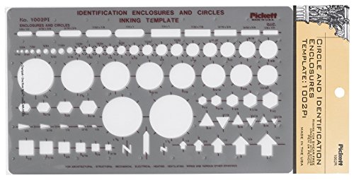 Pickett Circle and Identification Enclosures Template is a general purpose template containing circles, squares, rectangles, hexagons, diamonds and directional arrows. Built-in risers and smooth apertures reduce smudged lines. Made in USA. Pickett Templates - for all your drawing template needs.Feature