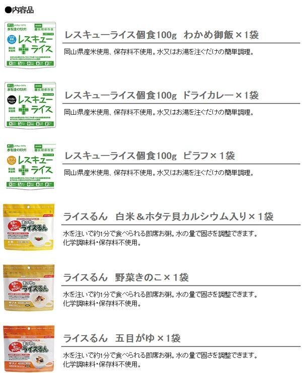 ■レスキューライス:ピラフ 【内容量】100g 【原材料】うるち米・具(鶏肉・鶏卵・コーン・人参)・食塩・カレー粉・砂糖・ビーフパウダー・ローストオニオンパウダー・パセリ・でん粉分解物・粉末油脂・植物性油脂・粉末醤油・調味料(アミノ酸等)・香料・香辛料抽出物・酸味料・酸化防止剤(ビタミンE)他 【製造者】株式会社山貴屋/岡山県岡山市北区吉備津1945-5