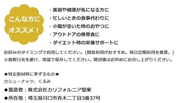 | 原材料 | アーモンド(アメリカ産) カシューナッツ(インド産) くるみ(アメリカ産) 乾燥クランベリー(アメリカ産)、砂糖、植物油脂 レーズン(アメリカ産)、植物油脂 |