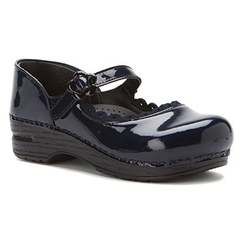 Her pretty feet will be the envy of all her friends when she's wearing the Dansko Jill mary jane. This versatile girls' dress shoe gives her healthy support in an easy-care patent leather package; the scalloped suede trim and flower-shaped buckle are pretty details. The APMA-certified Dansko Jill mary-jane shoe is finished with a lightweight polyurethane sole that absorbs shock with every step, keeping each step as comfortable as it is stable.Feature