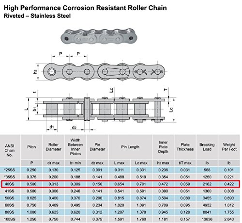 Donghua® #40 SS Stainless Steel Roller Chain, 10Ft With 1 Connecting Link, Single Strand, Corrosion Resistant Material, Durable In Harsh Elements