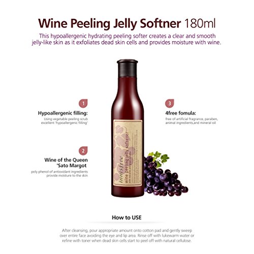 The hypoallergenic hydrating peeling softener creats a clear n smooth jelly-like skin as it exfoliates dead skin cells n provides moisture with wine.