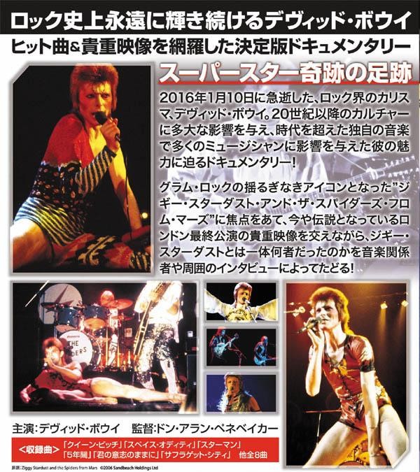 | ジギー・スターダストとは一体何者だったのか・・・ロック界のカリスマ、デヴィッド・ボウイ。時代を超えた独自の音楽で多くの音楽家に影響を与えた魅力に迫るドキュメンタリーDVD! |