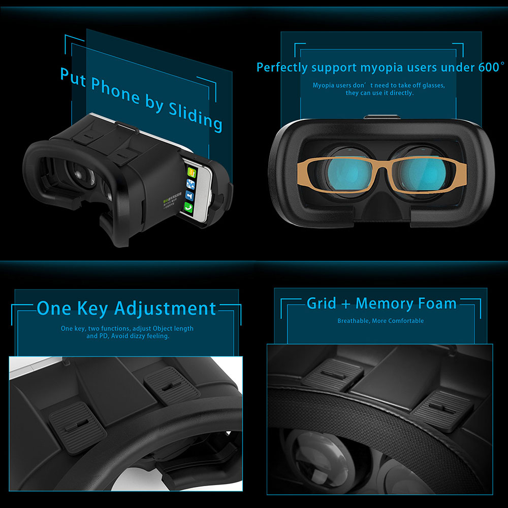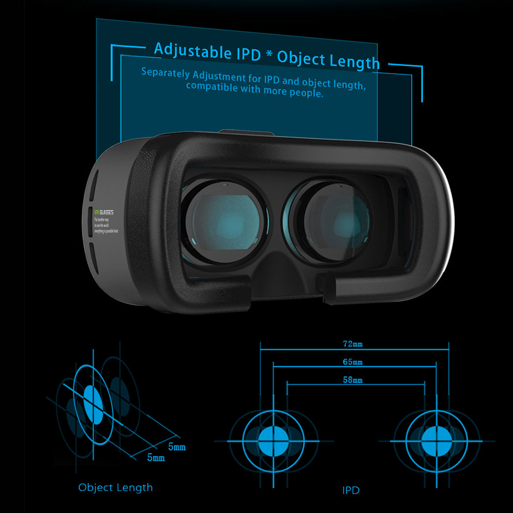 (Optical Axis Sliding Control function: You can slightly adjust the position of the aspherical optical resin lens through moving the button on the top of the 3D VR GLASSES so as to get a better experience of watching movies )