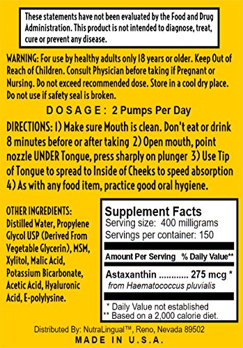 Astaxanthin has been found to have nearly 500 times the anti-oxidant power of Vitamin E, making it an important nutrient indeed. Unfortunately, it has extremely low oral bio-availability (products swallowed and absorbed through the intestinal tract), reducing potential benefits. Fortunately, because this liquid product is absorbed into the blood directly through the lining of the mouth (sublingual), it by-passes the "low bio-availability" problem found with swallowed pills and capsules. Formulated properly and taken as directed, sublinguals can achieve up to 98% absorption in just a few minutes, compared to 3 to 5 hours for the typical oral supplement. Product comes with a Pharmaceutical grade Pump Applicator which delivers a precise metered dose every time, eliminating the need for imprecise, awkward, fragile, and hard to keep clean Eyes Droppers that most liquid supplements use. This product is perfect for those who are unable or don't like taking pills, or for those who simply want the most Bio-Available supplement possible. MADE IN USA.Feature