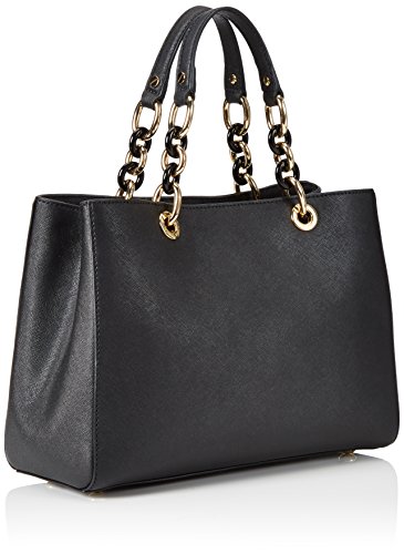 Gold-tone hardware; tortoiseshell rings at straps; logo charm