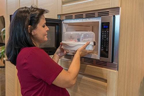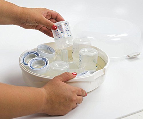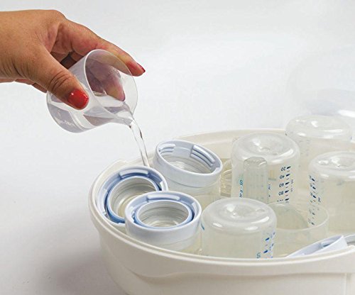 -. Feature : GERM-FREE Baby Bottles and Acessories / STERILIZES in as little as 2 minutes eliminating 99.9% of harmful bacteria / FITS ALL Standars and Wide Mouth Bottles / Easy to use, lightweight and effective / Plastic Tong and Measuring Cup included