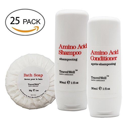Packaging include Individually Wrapped 30ml Shampoo 25 Bottles + Individually Wrapped 30ml Conditioner, 25 Bottles + Round Tissue Pleated 28g Cleaning Soap, 25 Bars. Not tested on animals. Environmental friendly.