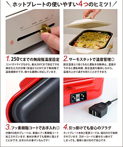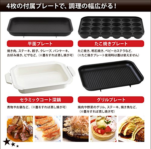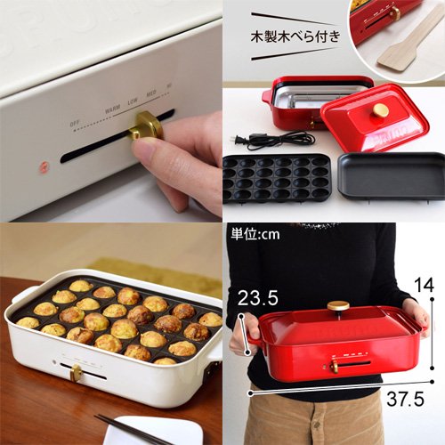 BRUNO의 콤팩트 핫 플레이트는,마침(정확히) 좋다크기느낌의 핫 플레이트.4매의 플레이트에 요리 폭이 넓어집니다♪ 【비고】평면/타코야끼의 플레이트/세라믹심 냄비/그릴 플레이트/타코야끼가 일시에 24개 탄다/무단계 온도 조절(보온~250℃) 【주의】식기 세척기와 건조기는 사용 불가/금속제의 헤라나 꼬치,나이프 등은 사용하지 않는다/사용중은 램프가 붙었다 # 사라지거나 하지만,써모스《닷토》의 온도 조정에 의한 현상입니다/「화이트」서는 노란색 보가 산 오프화이트에 가까운 색입니다