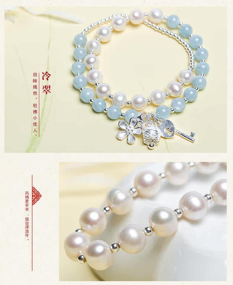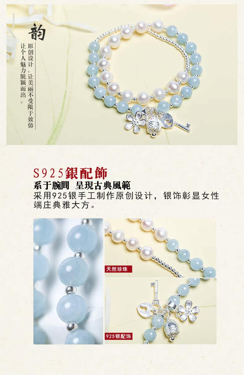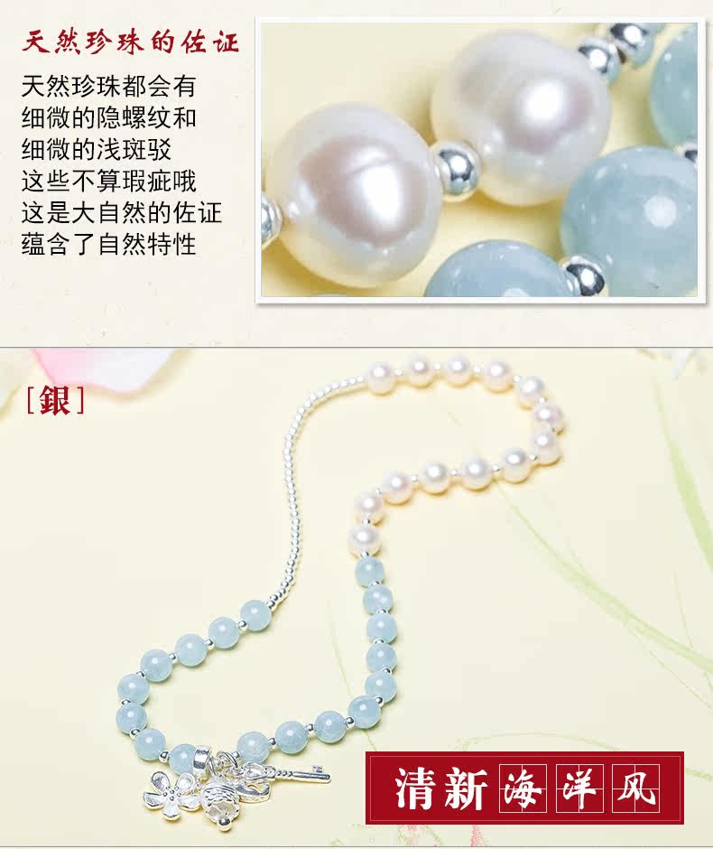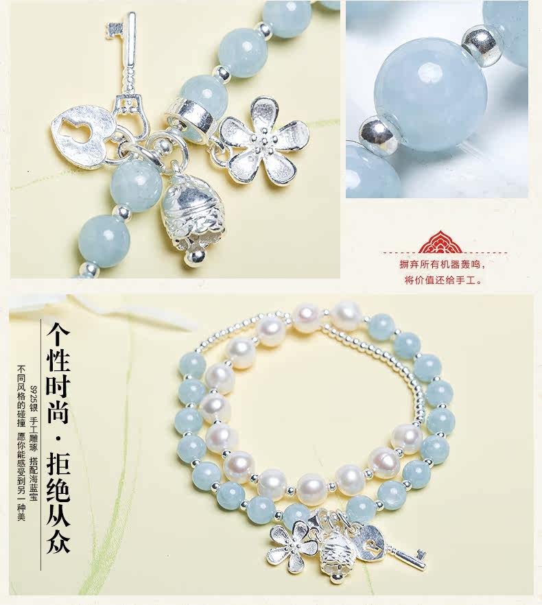 天然海蓝宝水晶淡水珍珠手链女心锁银饰手串节日礼物