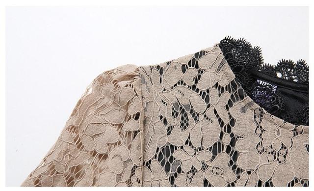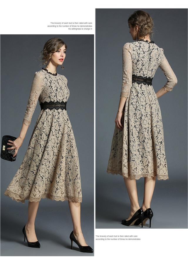 襟、袖口、裾はスカラップカットのレースで出来て、ウエストの切り替えが太いレースで、エレガントな演出に。