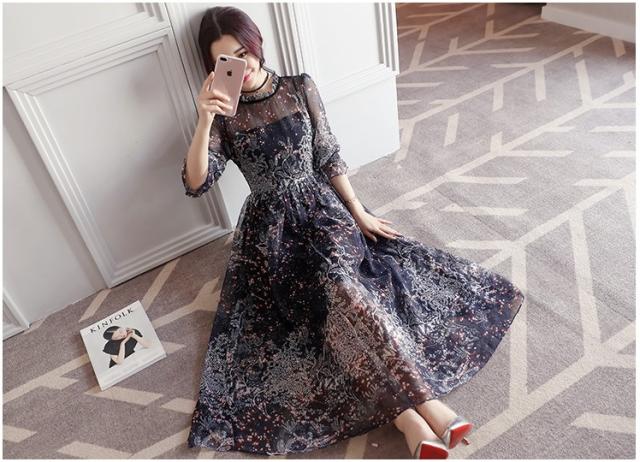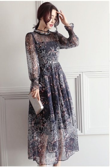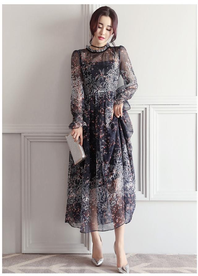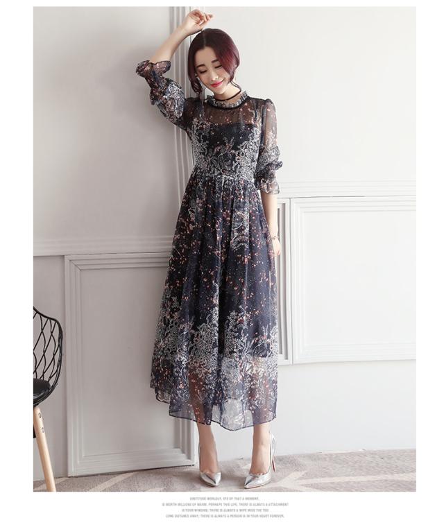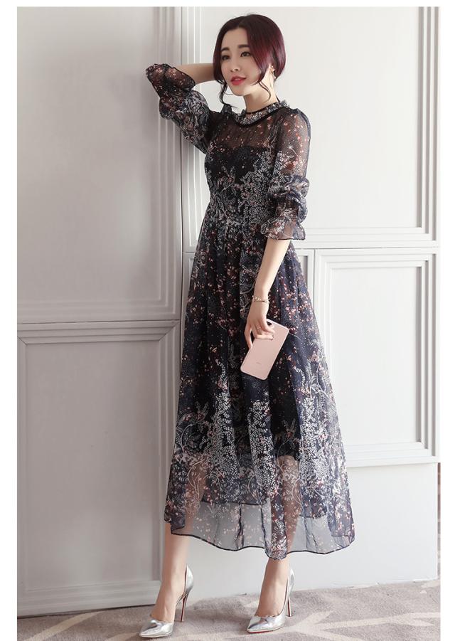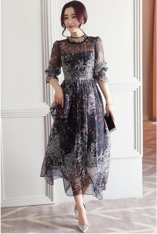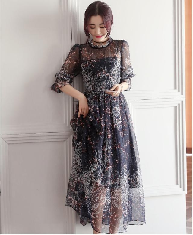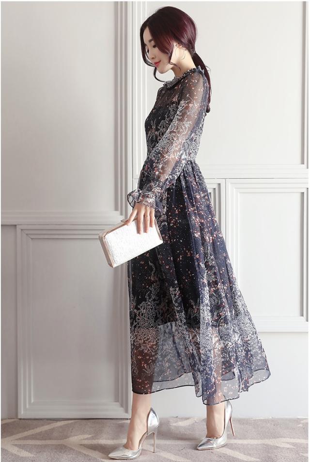 シースルー ワンピース フレア フリル シフォン ボリューム 花柄 五分袖 ハイネック ロング丈
