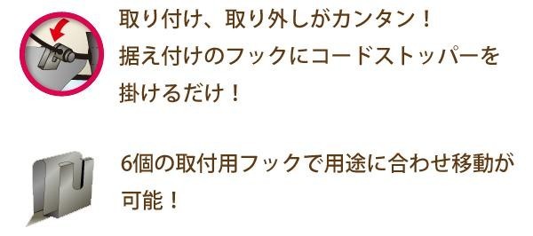 | 取り付け、取り外し簡単!専用フックにコードストッパーを掛けるだけ!6個の取付用フックで用途に合わせて移動が可能です。間仕切りにも十分なゆったりサイズ。用途に合わせて縦方向にロールアップすることが可能です。 |