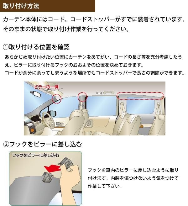 | セット内容 | カーテン2枚(面ファスナー付) 取付フック6個 コード1本 コードストッパー2個 ミニコードストッパー6個 |