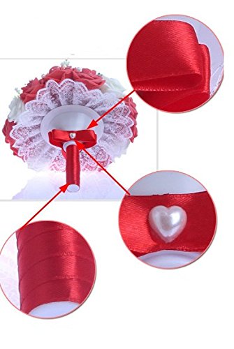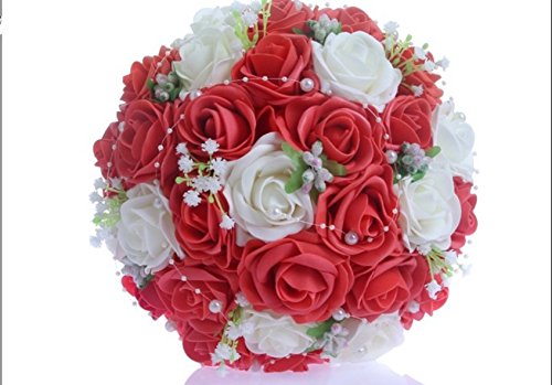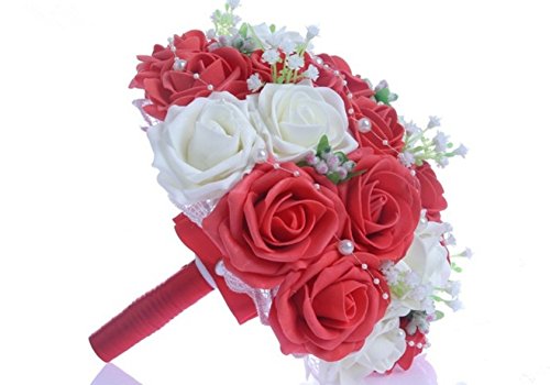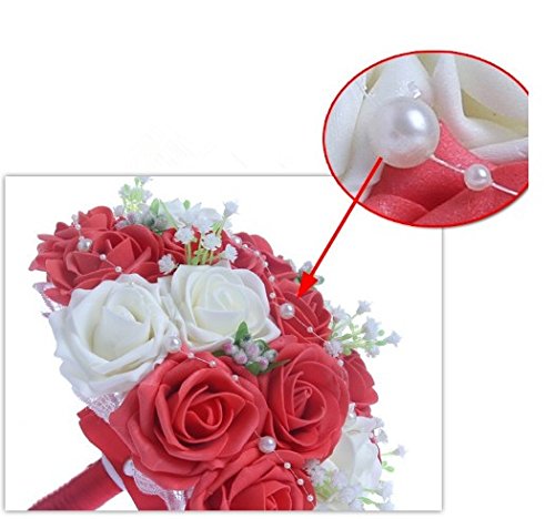 - Feature : Bridal Bouquet made with red and white Roses with Pearls Chain / 30pcs Bridal Bouquet 24-26cm W 33cm H / Silk flowers won't wilt in the heat or freeze in the cold. The consummate choice for all weather conditions / You can use flowers that may normally be out of season and there are also a wide variety of colors, above and beyond the limitations of mother nature. / The silk flowers available to us today are so glamorous and realistic you will be amazed. We think that many of the flowers are even more vibrant and beautiful that their fresh counterparts.