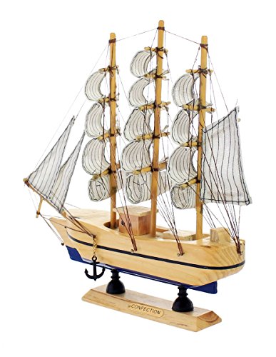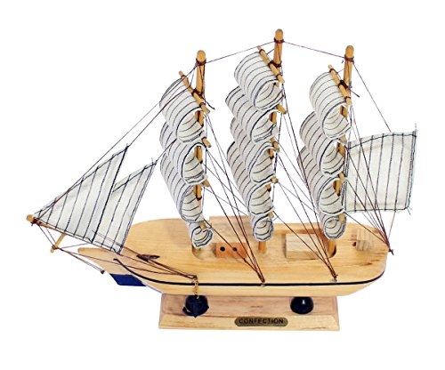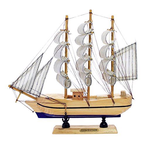 Decorative Wooden Replica Sailboat Model - White Sails Light Wooden Body Blue Bottom With Black Line