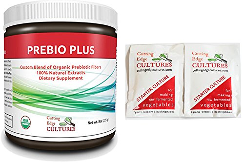 Studio : Cutting Edge Cultures Publisher : Cutting Edge Cultures Binding : Health and Beauty Product Description Combo Pack includes 1 Prebio Plus 8oz jar 2 Pouches Vegetable Starter Culture= PREbitotics PRObiotic COMBO! Prebio Plus is a custom blend of organic prebiotic fibers. Prebiotics can encourage the growth of beneficial bacteria already living in the body and can also aid in the growth and maintenance of probiotics. Prebio Plus is Easy to Use. Add Prebio Plus to: ? Any food or beverage, hot or cold. ? Kefir or cultured veggies while they're culturing. You can even add it after they're done for an extra boost. ? Your kefir to make it super creamy. If your kefir has over-separated Prebio Plus helps to make it creamy again. ? Salad dressing or condiments such as kombucha mayo or kefir cheese for an added probiotic boost. ? Your morning coffee or tea. Start your inner bacteria off to a running start at the beginning of the day! ? Baked goods. Or just sprinkle it on top of salads or even toast jam. Prebio Plus is Food for Your Bacteria. Prebiotics are just as important as probiotics, and you should use them together. Prebiotics naturally reside in all kinds of fruits, vegetables, and some nuts other foods. However, we found some of the strongest sources of prebiotics and placed them in an easy to use powder form. Cutting Edge Starter Culture is a synergistic blend of carefully selected strains - each plays a vital role in optimizing the natural lacto fermentation process to ensure that you achieve healthy and delicious results. This product is specifically designed to supercharge your cultured vegetables, enhance taste and crispness, and ensure that your fermented foods are rich in probiotics. Our unique starter culture is designed to help you create probiotic and nutrient rich superfoods, including home-made sauerkraut, kimchee, cultured beets or carrots, all in the comfort of your kitchen. Optimize the natural lacto fermentation process. Pack includes 2 sachets; each sachet ferments 5 pounds of vegetables 0