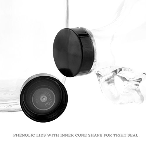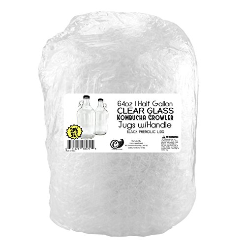 Studio : Cornucopia Brands Publisher : Cornucopia Brands Product Description 64-Ounce / Half Gallon Clear Glass Kombucha Growler Jugs w/ Black Phenolic Lids (2-Pack); Great for Home Brew, Distilled Water, Cider More These bottles are so great you will want more than one . . . which is why we are providing a 2-pack. Use for: * kombucha 2nd ferment* home brew * iced tea * root beer * water kefir * fermentation * wine * storing chemicals such as hydrogen peroxide or cleaning supplies* cider* Cooking oils* Storing water in the fridge--especially good for distilled water as water absorbs taste from plastic or metal* Homemade vinegar* cold brew coffee* herbal tinctures magic potions* Decorative use / coin bank SIZE: Each jug is 10.75 inches tall 4.9 inches diameter. Jar mouth is 1.1 inches inner diameter. CAPACITY: 64 ounces = 8 cups = 2 quarts = half gallon = 1.9 liters COLOR: clear transparent glass is great for items you want to show off or see the contents easily. QUANTITY: Two jugs are a great value deal. WEIGHT: Each jug weighs 1 lb. empty. CAPS: These lids are known as phenolic or polyseal lids as they have an inner cone-shaped plastic seal which is ideal for fermentation. 0 |