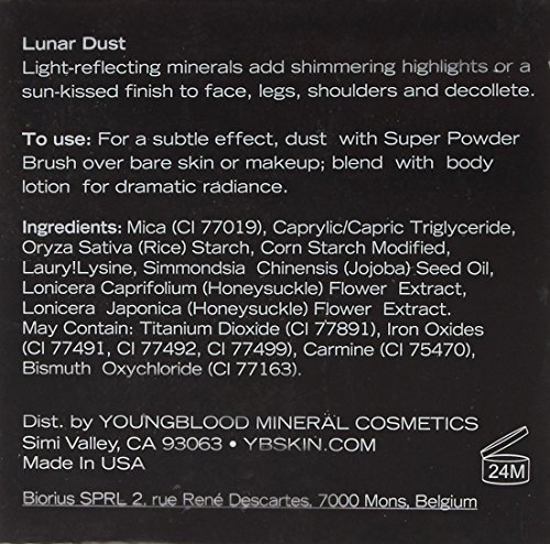 ReleaseDate : 2013-08-31 Studio : Youngblood Publisher : Youngblood Binding : Health and Beauty Product Description Youngblood - powder - lunar dust light reflecting mineral powder illuminates your skin with a beautiful glow sheer and easily glides on applied as a bronzer on face, legs, shoulder and decolletage perfect for all skin types. These cosmetics are authentic and at an affordable price. Provides brilliant, long lasting color. 100% authentic. 0