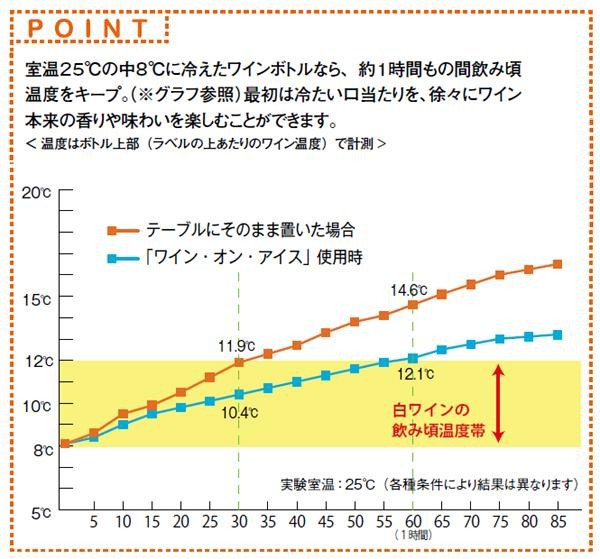 氷と2重構造になったワインクーラーの側面部分が、外気によってワインの温度が上昇するのを防ぎます。ワイン・オン・アイスにボトルをいれると、約1時間もの間飲み頃温度をキープ。最初は冷たい口当たりを楽しみ、ワイン本来の香りや味わいを発揮する温度帯でワインを楽しむことができるので、白ワインや軽い赤ワインなどの「ワインクーラー」を必要とするワインには、理想的な温度でワインを楽しむことができます。 |