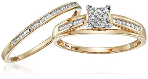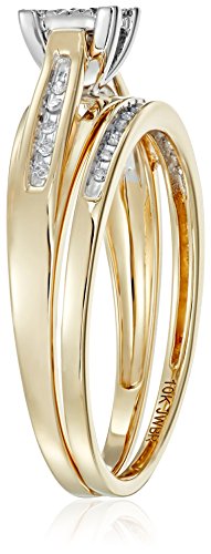 -. Binding : Jewelry -. Brand : Amazon Collection -. Color : yellow -. Department : womens -. Feature : Bridal ring set in 10k yellow gold featuring engagement ring with nine-diamond square centerpiece and channel-set diamonds in band / Wedding band features slender silhouette and channel-set diamonds along top curve / All our diamond suppliers confirm that they comply with the Kimberley Process to ensure that their diamonds are conflict free. / Imported -. Label : Amazon Collection -. Manufacturer : Amazon Collection -. Model : 79198D-Parent -. MPN : 79198D-Parent -. PartNumber : 79198D-Parent -. ProductGroup : Jewelry -. ProductTypeName : FINERING -. Publisher : Amazon Collection -. Studio : Amazon Collection -. Title : 10k Yellow Gold Diamond Square Center Bridal Ring Set (1/7 cttw, I-J Color, I2-I3 Clarity)