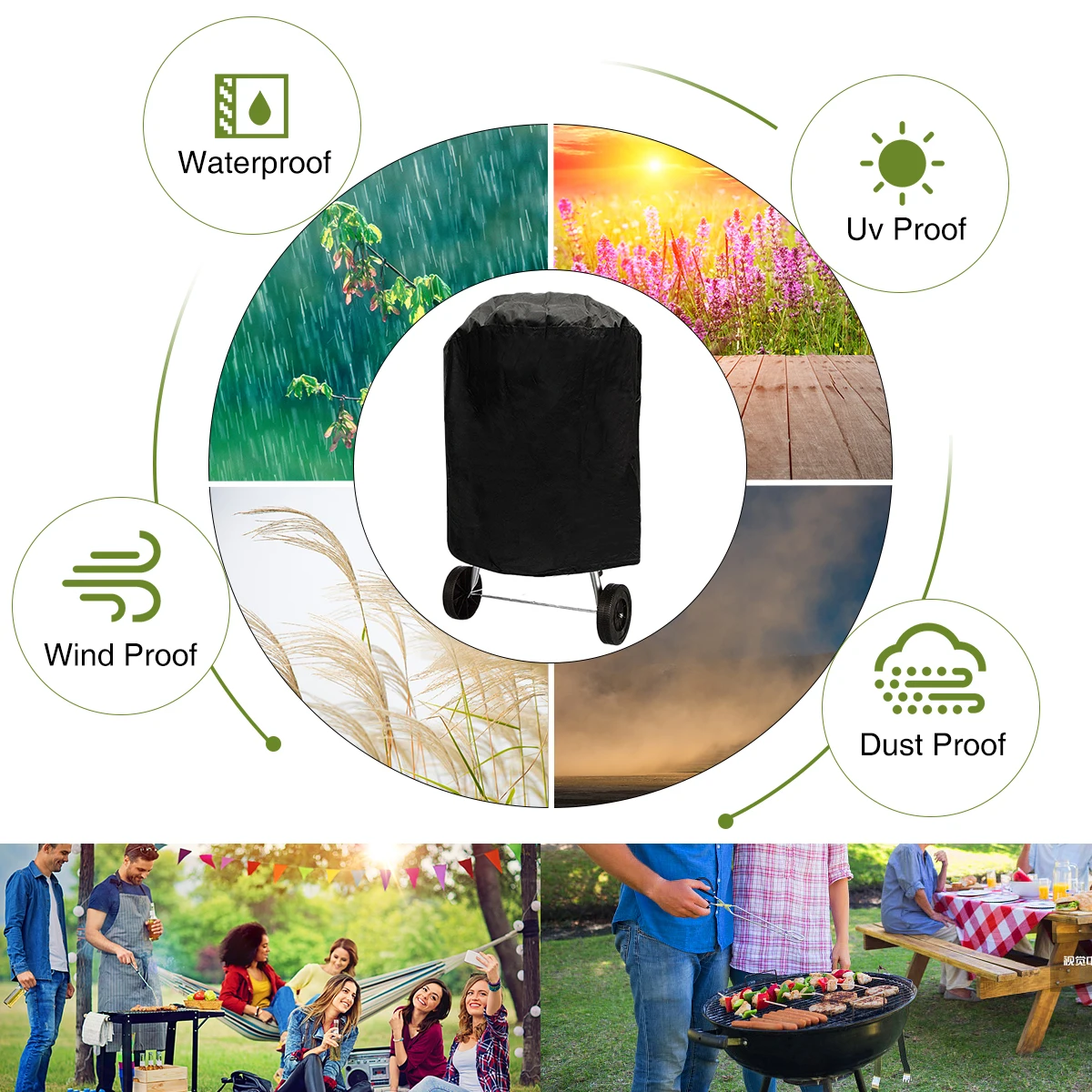Made of woven polyester material with PU coating, which protects your grill from rain, dust, wind, leaves, insects, etc.