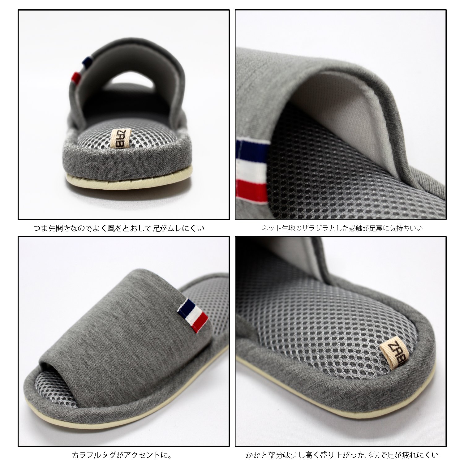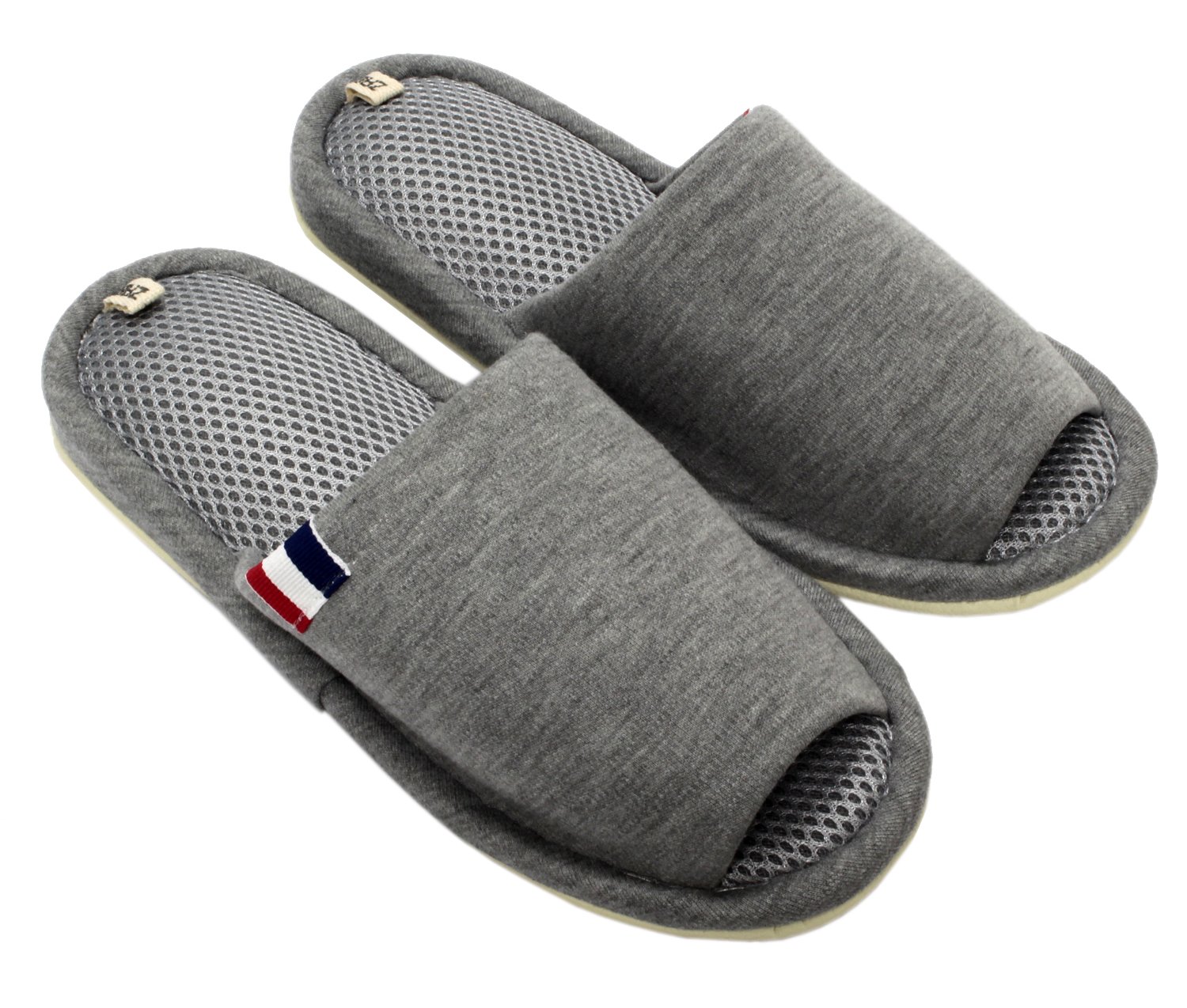 ● gray plain, stylish slippers that accentuate the tag of blue, white, red