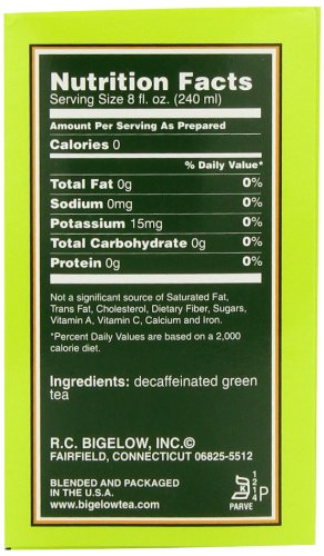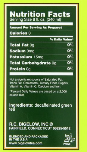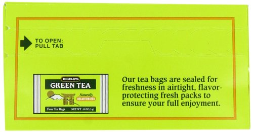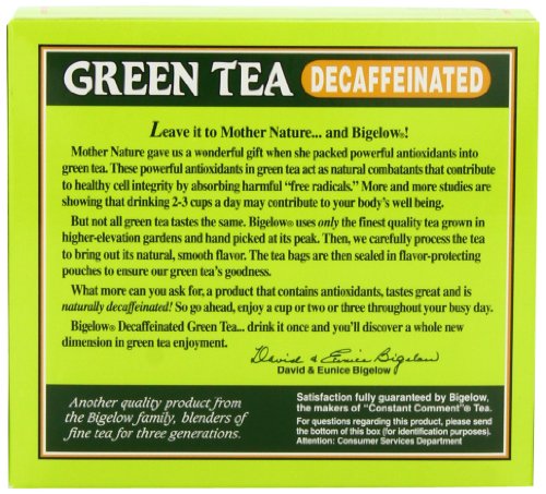 Delicate flavor. Our tea bags are sealed for freshness in airtight, flavor protecting fresh packs to ensure your full enjoyment. Healthy antioxidants. Leave it to Mother Nature, and Bigelow! Mother Nature gave us a wonderful gift when she packed powerful antioxidants into green tea. These powerful antioxidants in green tea act as natural combatants that contribute to healthy cell integrity by absorbing harmful free radicals. More and more studies are showing that drinking 2-3 cups a day may contribute to your body's well being. But not all green tea tastes the same. Bigelow uses only the finest quality tea grown in higher-elevation gardens and hand picked at its peak. Then, we carefully process the tea to bring out it's natural, smooth flavor. The tea bags are then sealed in flavor-protecting pouches to ensure our green tea's goodness. What more can you ask for, a product that contains antioxidants, tastes great and is naturally decaffeinated! So go ahead, enjoy a cup or two or three throughout your busy day. Bigelow Decaffeinated Green Tea, drink it once and you'll discover a whole new dimension in green tea enjoyment. Another quality product from the Bigelow family, blenders of fine tea for three generations. Blended and packaged in the U.S.A.Feature