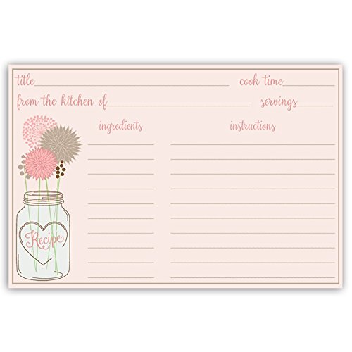Recipe Cards, Mason Jar, Shades of Pink, Painted, Housewarming, Watercolor, Bridal Shower, Housewarming, Wedding, Gift, Flowers, Country, Double Sided, with Lines, Size 4 x 6, 24 Printed Cards,