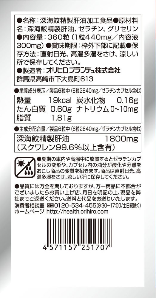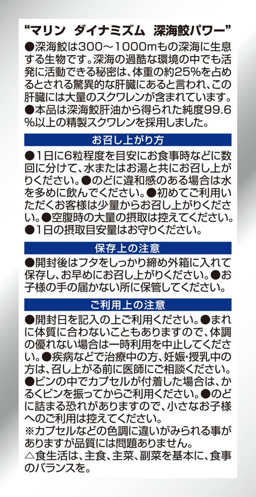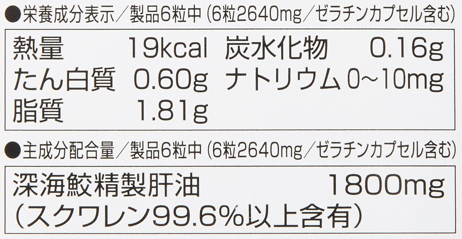 栄養成分 : 製品6粒(2640mg)深海ザメ精製肝油 1800mg (スクワレン99.6%以上含有)