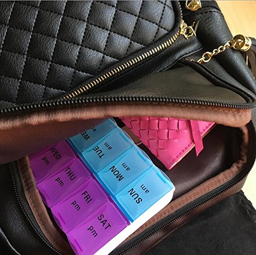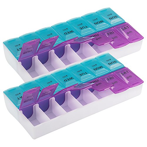 This pill organizer has everything to make it an optimal choice. It consists of fourteen large compartments with separate snap lids for every compartment. The lids are designed translucent so that you can check your regularity without even opening them. Each lid has the first letter of a week-day with am and pm label. Lightweight and small size makes it perfect for long journey. 0
